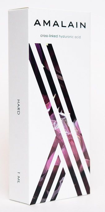 Amalain Hard филлер высокой плотности производится на основе высокомолекулярной гиалуроновой кислоты (20 мг/мл) неживотного происхождения поперечно сшитой эфиром BDDE.